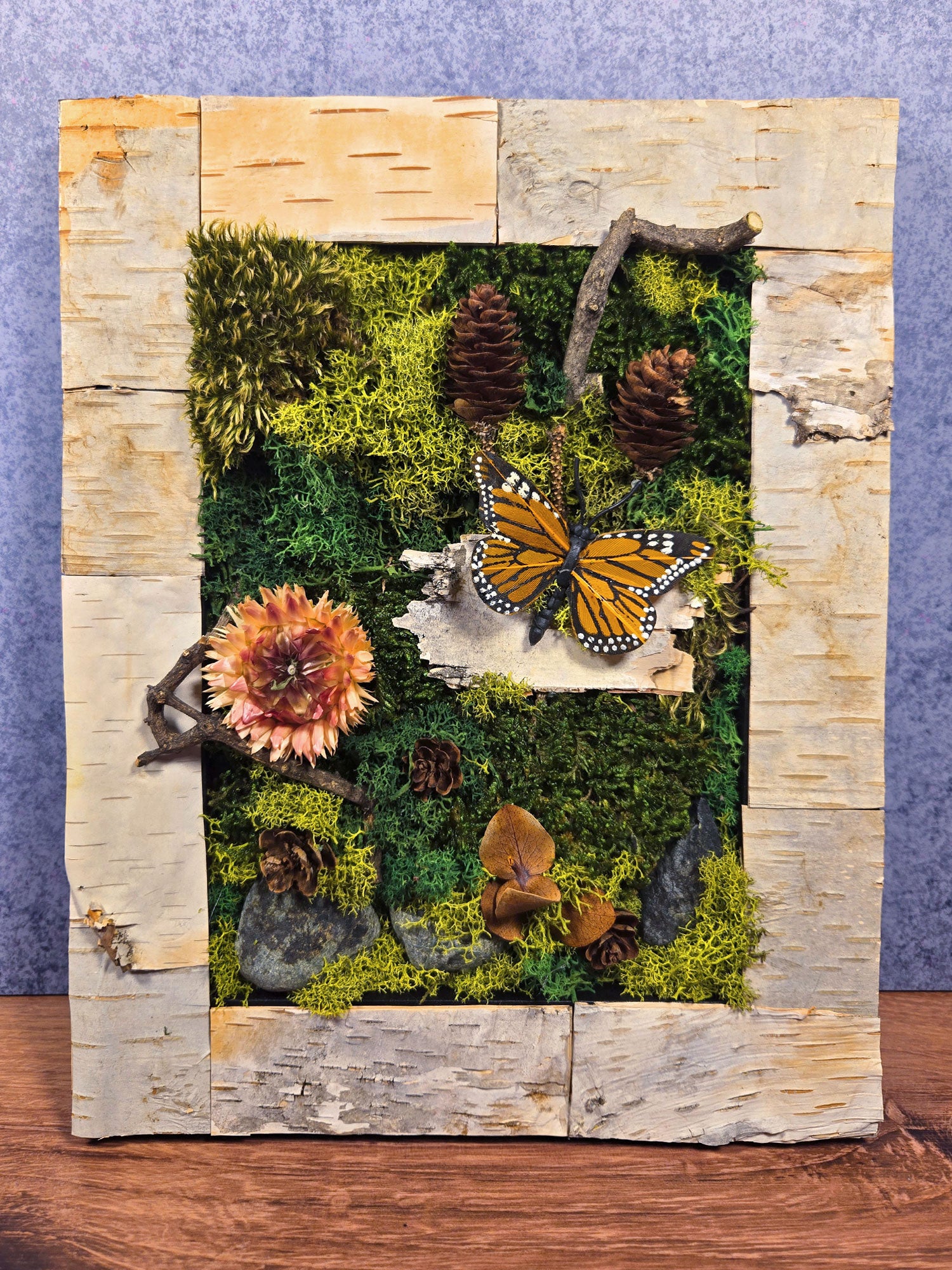 This one-of-a-kind moss art creation is handcrafted with preserved moss, birch bark and twigs, faux butterfly, stones, pinecones and dried floral accents on a wood frame.