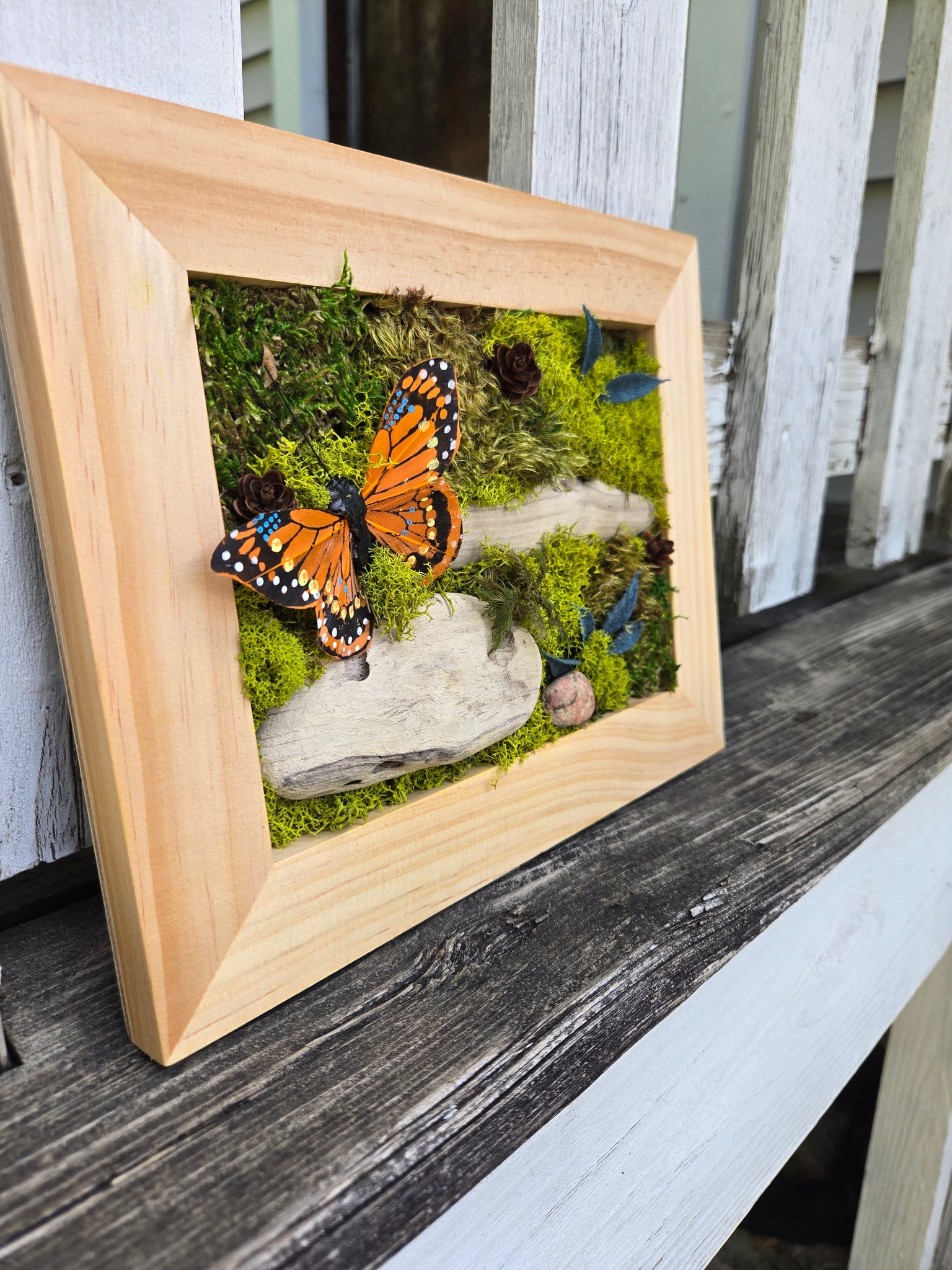 This one-of-a-kind botanical art piece is handcrafted with preserved moss (reindeer, mood, sheet), faux blue leaves, drift wood, faux butterfly, rock and pinecones on a wood frame.