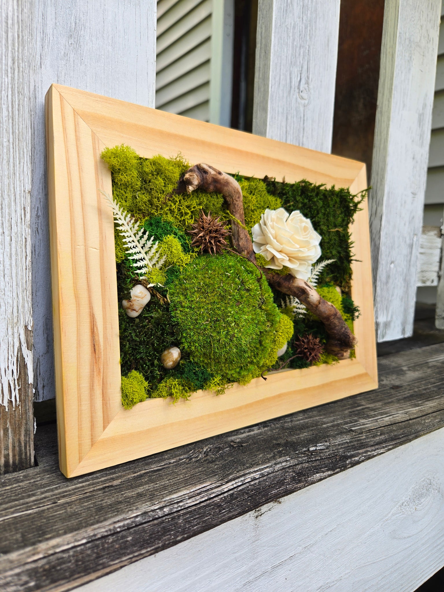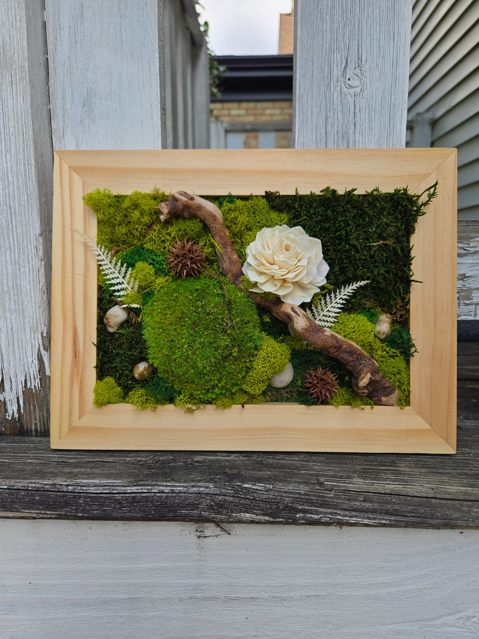 This one-of-a-kind botanical art piece is handcrafted with preserved moss (reindeer, pillow), wooden flower, faux ferns, branch, rocks and dried seed pods on a wood frame.